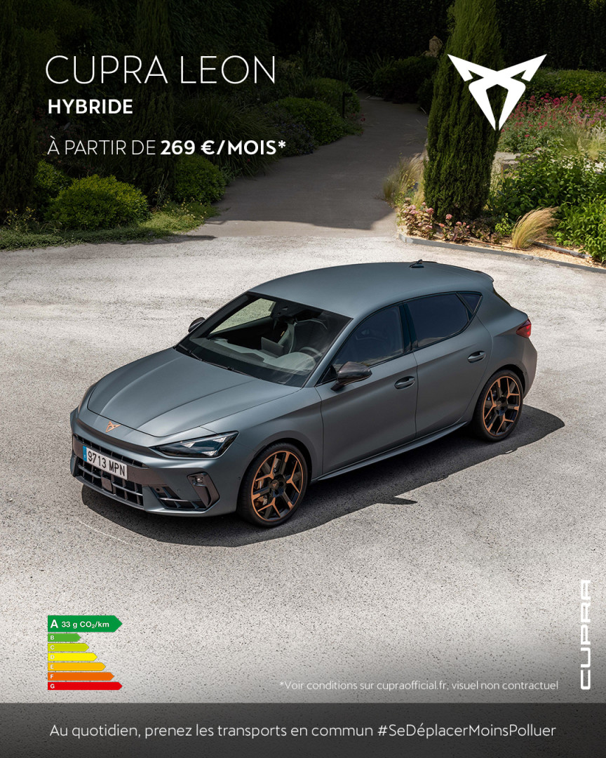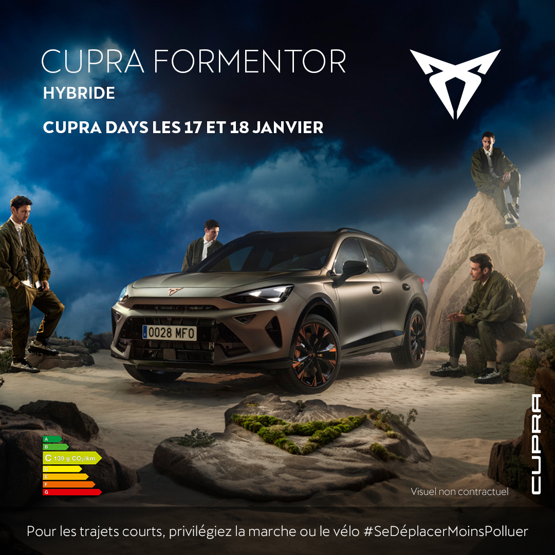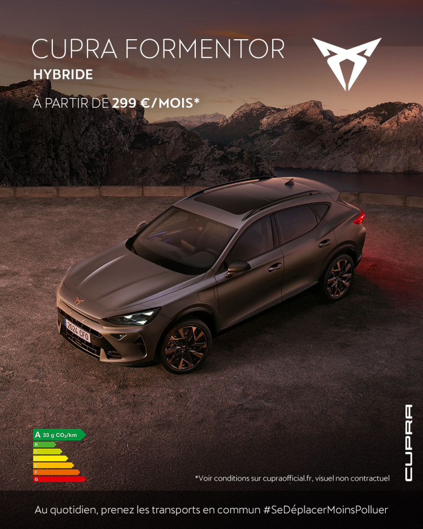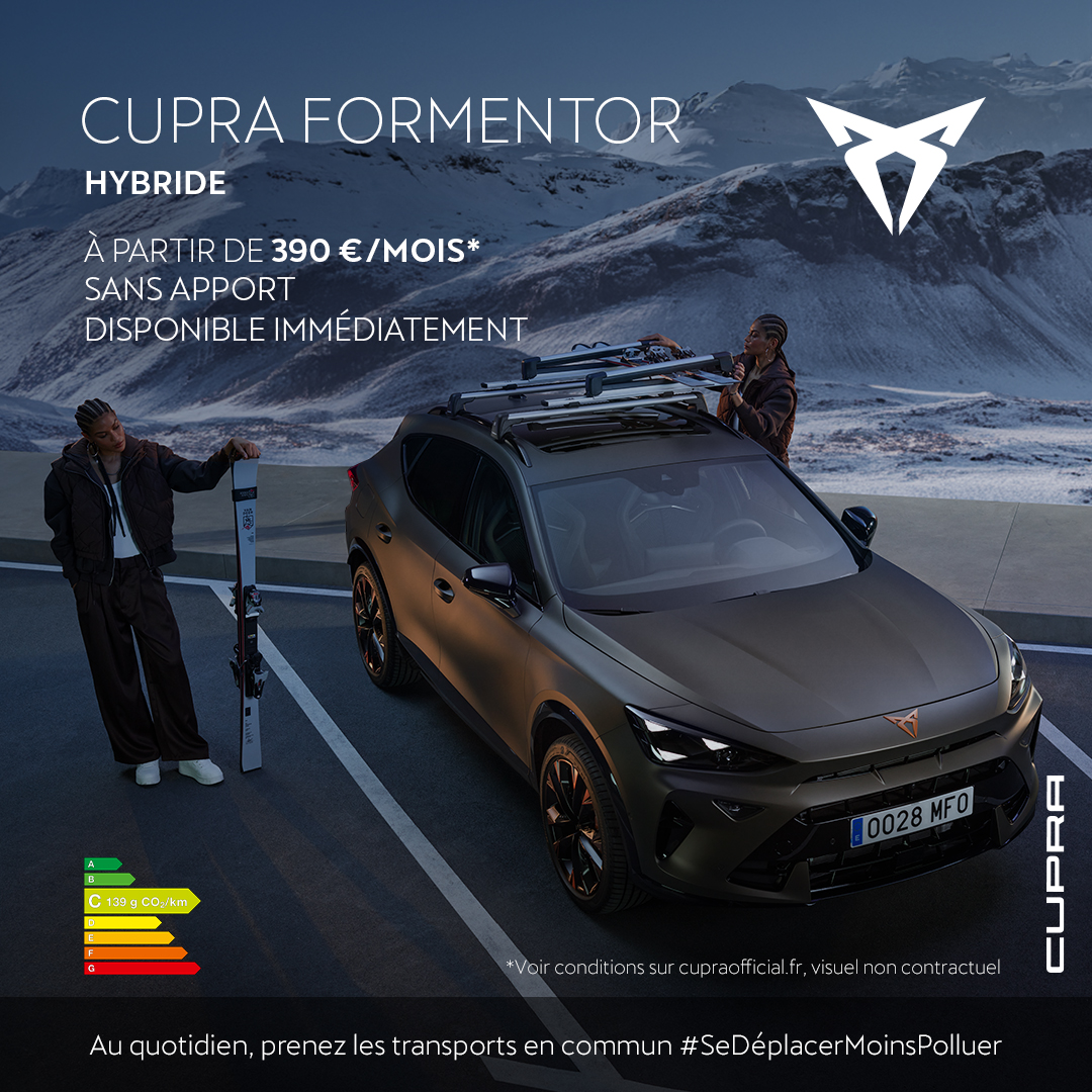 Offre réservée aux particuliers, non cumulable avec toute autre offre en cours, chez tous les Distributeurs CUPRA (France métropolitaine) présentant ce financement et valable jusqu’au 31/01/2026 pour toute commande d’une Nouveau CUPRA Formentor V 1.5 eTSI Hybrid 150 DSG7 (mHEV) passée avant le 31/01/2026 et livrée avant le 31/07/2026. (1) Location longue durée sur 37 mois. 37 loyers de 390 €. Déduction faite de l’offre de remise de 6500 €. Exemple pour une Nouveau CUPRA Formentor V 1.5 eTSI Hybrid 150 DSG7 (mHEV) en location longue durée sur 37 mois et pour 30000 km maximum. Nouveau CUPRA Formentor V1.5 eTSI Hybrid 150 DSG7 (mHEV) consommation mixte WLTP (min-max l/100km) : 5,7-6,2. Émissions de CO2 WLTP (min – max g/km) : 130-139 (2) Contrat d’entretien VIP souscrit auprès de Volkswagen Bank GmbH, coût mensuel de 8,1€ inclus dans les loyers. (3) Garantie 2 ans + 1 an de garantie additionnelle.