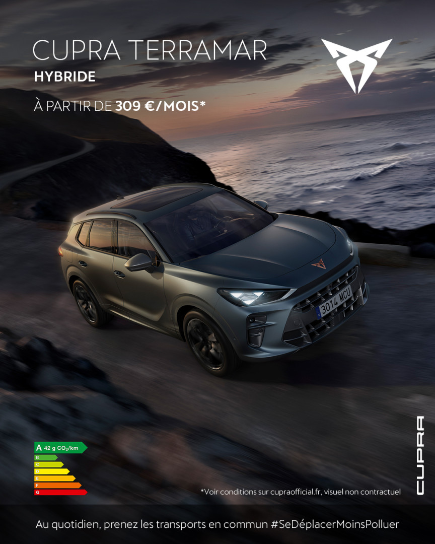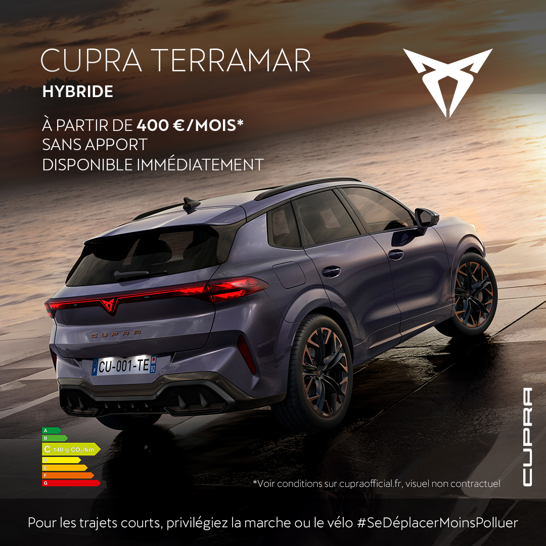 Offre réservée aux particuliers, non cumulable avec toute autre offre en cours, chez tous les Distributeurs CUPRA (France métropolitaine) présentant ce financement et valable jusqu’au 31/01/2026 pour toute commande d’une Nouveau CUPRA Terramar One 1.5 eTSI Hybrid 150 DSG7 (mHEV) passée avant le 31/01/2026 et livrée avant le 31/07/2026. (1) Location longue durée sur 37 mois. 37 loyers de 400 €. Déduction faite de l’offre de remise de 8000 €. Exemple pour une Nouveau CUPRA Terramar One 1.5 eTSI Hybrid 150 DSG7 (mHEV) en location longue durée sur 37 mois et pour 30000 km maximum. Nouveau CUPRA Terramar One1.5 eTSI Hybrid 150 DSG7 (mHEV) consommation mixte WLTP (min-max l/100km) : 6,1-6,3. Émissions de CO2 WLTP (min – max g/km) : 139-144 (2) Contrat d’entretien VIP souscrit auprès de Volkswagen Bank GmbH, coût mensuel de 8,2€ inclus dans les loyers. (3) Garantie constructeur 5 ans.