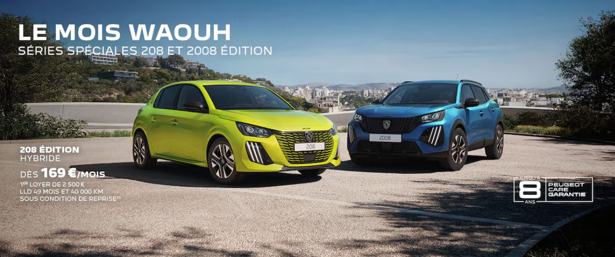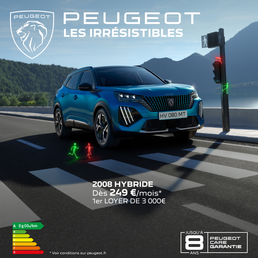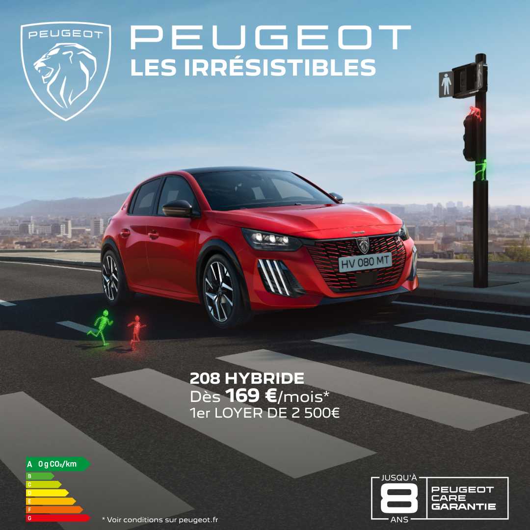 (1) Exemple pour une location longue durée (LLD) d’une 208 Style Hybrid 110 ch e-DCS6 neuve, hors option. Montants exprimés en TTC hors autres prestations facultatives. Offre non cumulable, réservée aux particuliers, sous condition de reprise. Valable pour toute commande du 01/01/2026 au 02/02/2026 auprès du réseau Peugeot participant. Sous réserve d’acceptation du dossier par CREDIPAR, loueur et SA au capital de 138.517.008 €, RCS Versailles n° 317 425 981, ORIAS 07004921 (www.orias.fr), 43 Rue Jean Pierre Timbaud 78300 POISSY.