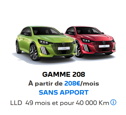 (1) Exemple pour une location longue durée (LLD) d’une 208 Style essence 100 ch BVM6 neuve, hors option. Montants exprimés en TTC hors autres prestations facultatives. Offre non cumulable, réservée aux particuliers, valable sous condition de reprise pour toute commande d’un véhicule, commandé du 29/08/2025 au 30/09/2025 auprès du réseau Peugeot participant. Sous réserve d’acceptation du dossier par CREDIPAR, loueur et SA au capital de 138.517.008 €, RCS Versailles n° 317 425 981, ORIAS 07004921 (www.orias.fr), 43 Rue Jean Pierre Timbaud 78300 POISSY.