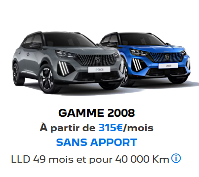 (2) Exemple pour une location longue durée (LLD) d’un 2008 Style essence 100 ch BVM6 neuf, hors option. Montants exprimés en TTC hors autres prestations facultatives. Offre non cumulable, réservée aux particuliers, valable sous condition de reprise pour toute commande du 29/08/2025 au 30/09/2025 auprès du réseau Peugeot participant. Sous réserve d’acceptation du dossier par CREDIPAR, loueur et SA au capital de 138.517.008 €, RCS Versailles n° 317 425 981, ORIAS 07004921 (www.orias.fr), 43 Rue Jean Pierre Timbaud 78300 POISSY.