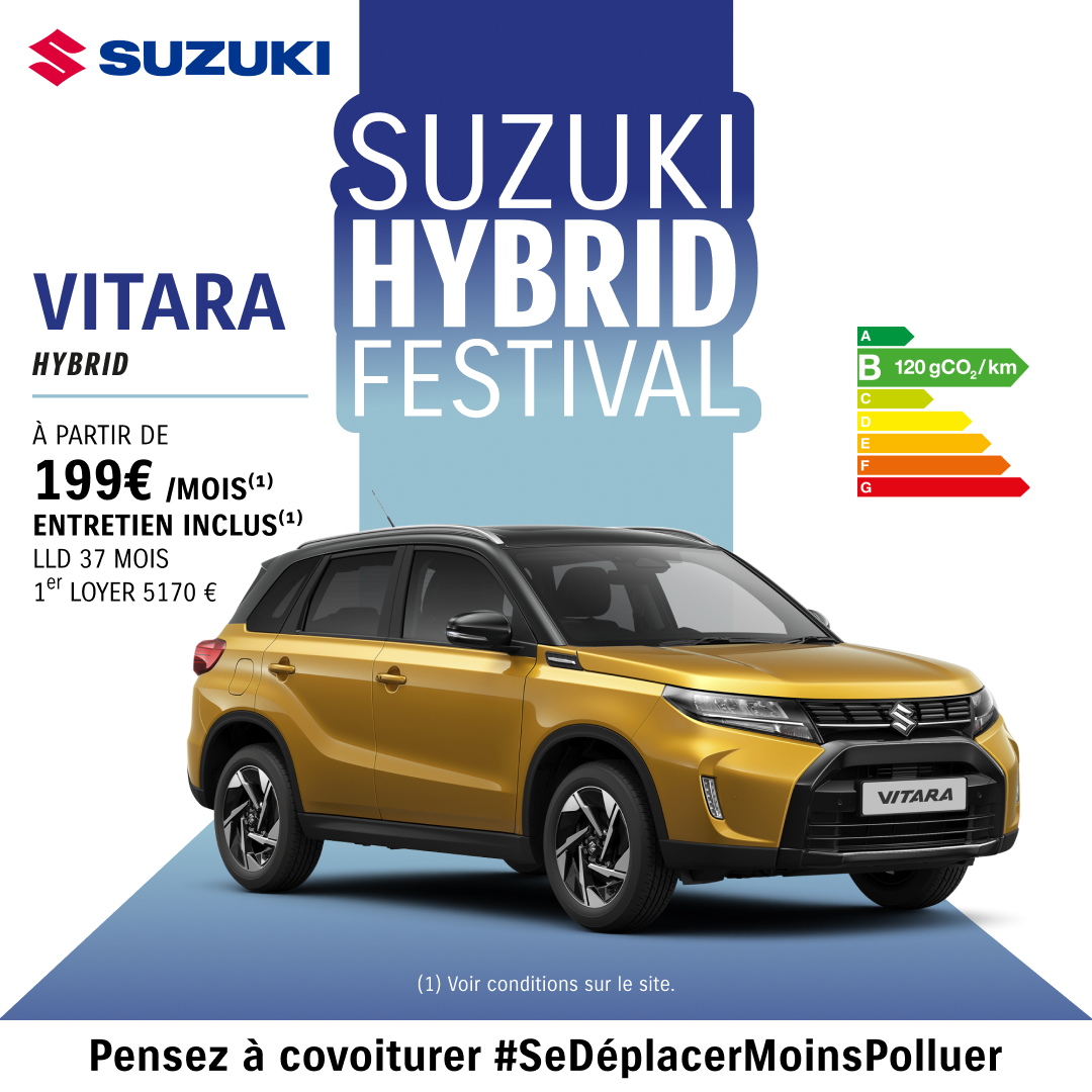 (2) Location Longue Durée pour 37 mois et 30 000 kilomètres pour un Suzuki Vitara 1.4 Boosterjet Hybrid Avantage, 1er loyer de 5 170 € , puis 36 loyers de 199 €. Offre réservée aux particuliers, valable du 01/09/2025 au 31/10/2025 inclus, dans le réseau participant. Sous réserve d’acceptation de votre dossier par Suzuki Finance, département de Cofica Bail, S.A. au capital de 14 485 544 €, 399 181 924 RCS Paris, siège social : 1 boulevard Haussmann 75 009 Paris, ORIAS n° 07 023 197. Modèle présenté : Suzuki Vitara 1.4 Boosterjet Hybrid Style hors option peinture métallisée So’Color, aux mêmes conditions puis 36 loyers de 247€/mois.