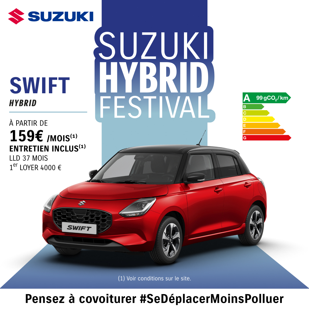 (1)Location Longue Durée pour 37 mois et 30 000 kilomètres pour une Suzuki Swift 1.2 Hybrid Avantage, 1er loyer de 4 000 €, puis 36 loyers de 159 €.